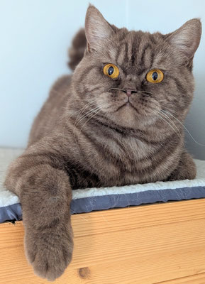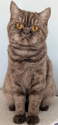 Glamour, alias Glamy, est une femelle British shorthair de couleur chocolat smoke génétiquement blotched. Cela lui donne un look très sauvage que j'adore.
